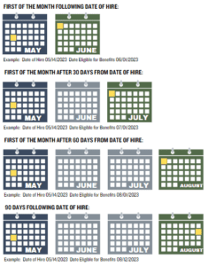 Below is a calendar with some examples of what each waiting period and benefits start date would look like using the same hire date of 5/14/2023.